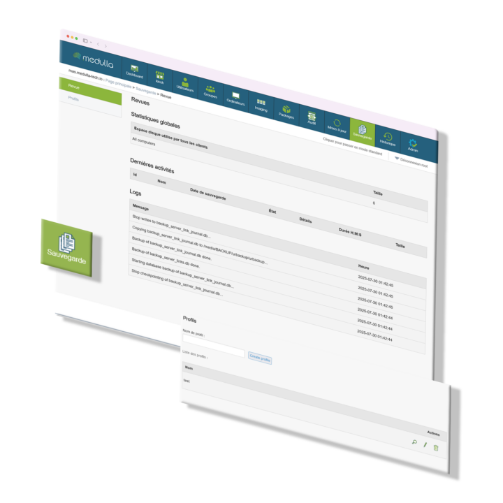 La solution de gestion de la sauvegarde et de la restauration permet d’assurer la protection continue des données des postes de travail et serveurs, avec une capacité de récupération rapide en cas d’incident. Grâce à des mécanismes de sauvegarde incrémentielle, une supervision centralisée et des alertes en cas d’échec, elle garantit une résilience optimale du système d’information.