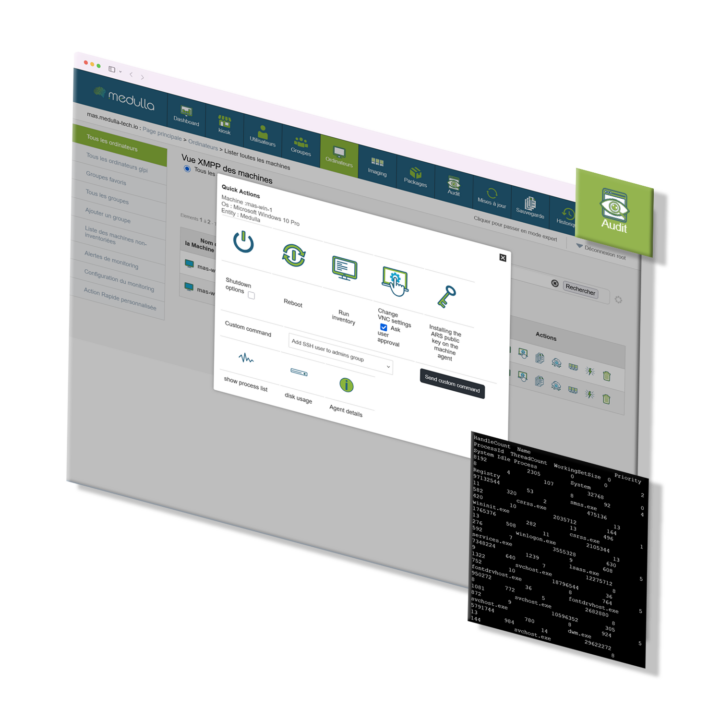 La fonctionnalité s’intègre dans la console d’administration centralisée et alimente en temps réel les modules d’inventaire, d’audit et de conformité. Sa mise en œuvre ne nécessite aucun déploiement complémentaire. Open source, scalable, Medulla fonctionne sur plus de 100 000 postes et s’adapte à toutes les topologies réseau.